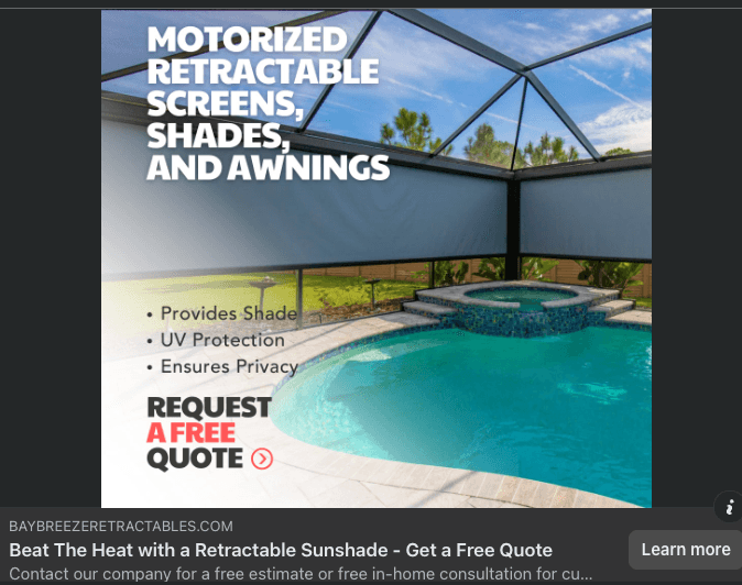 We combined SEO, Meta Ads, and Google Ads to ensure Bay Breeze appeared wherever potential customers were searching, scrolling, or researching. SEO positioned Bay Breeze as a trusted local authority for retractable screens and awnings, while Meta Ads, supported by custom image and video creative, generated demand and awareness among homeowners before they were actively searching.