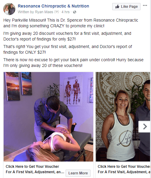 Hyper-targeted Facebook ad > Landing page (this is where the user inputs their name and email and downloads a voucher for their chiropractic adjustment) > User receives an automated email containing their voucher > User is added to mailing list for future marketing purposes.